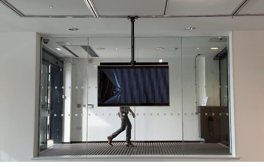 Contact Points explores the shifting roles of the observer and the observed within the gallery. Instead of passively viewing, audiences are watched by the digital screen, which tracks and responds to their presence. A watchful eye follows the viewer’s movement, cutting through a curtain of vertical lines that bend and distort in response to each interaction. This exchange disrupts traditional boundaries between viewer and object, raising questions of surveillance, agency, and intimacy. By reversing the direction of observation, Contact Points confronts the politics of visibility and asks how it feels when the artwork itself is watching you?